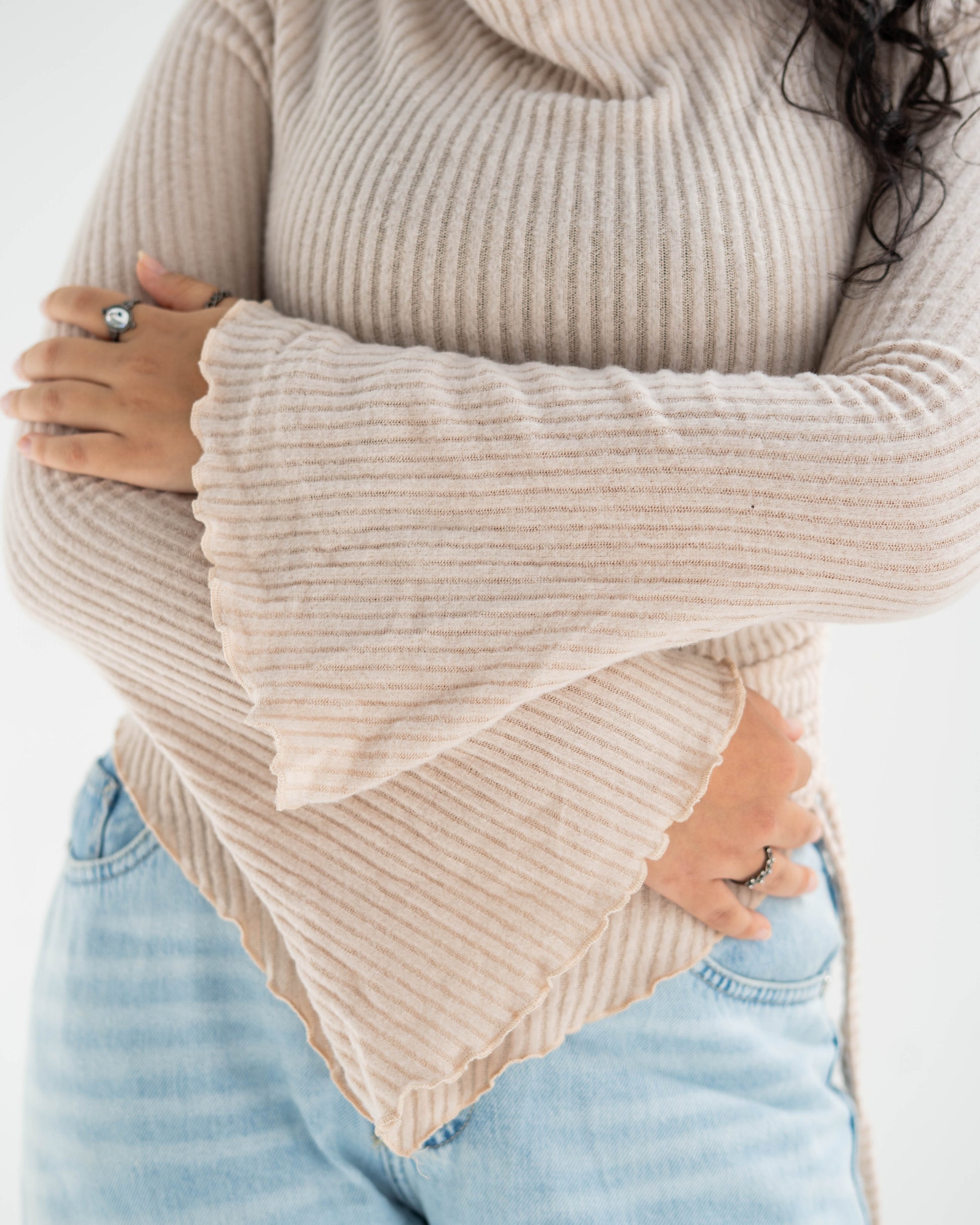 These ribbed knit tops, available in chic beige and sleek black, offer a perfect balance of style and comfort. Featuring a flattering fit with a unique asymmetrical hem and subtle detailing at the sleeves, they bring a modern twist to a classic wardrobe staple. Whether paired with jeans or skirts, these tops are ideal for casual outings, layering in cooler weather, or creating a laid-back yet fashionable look. Choose between neutral beige for a softer vibe or bold black for a timeless, sleek statement.