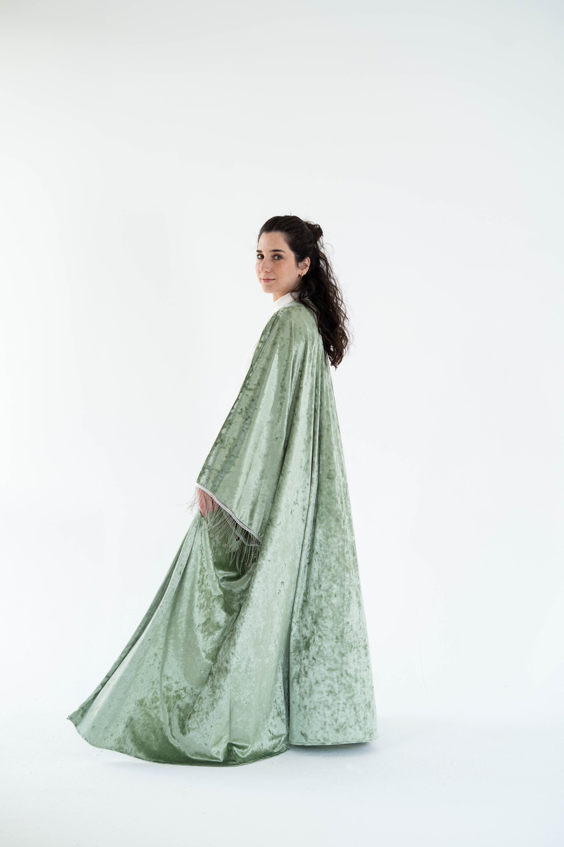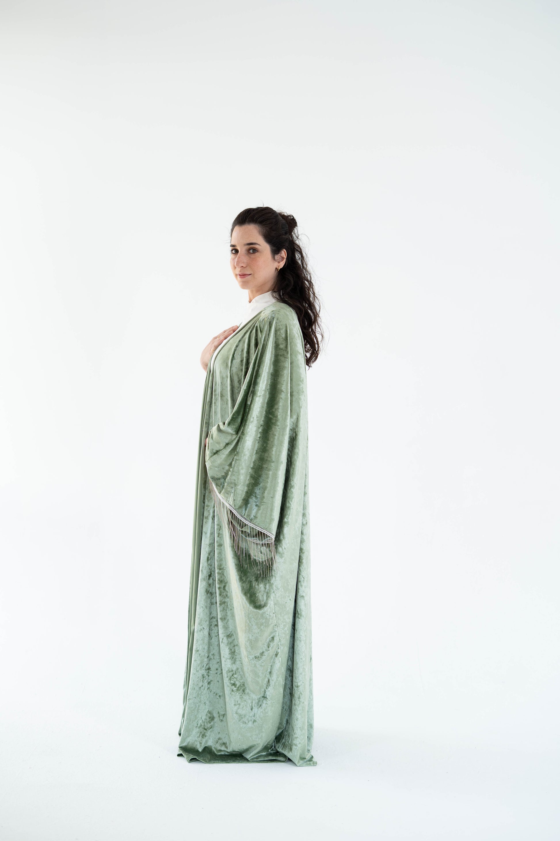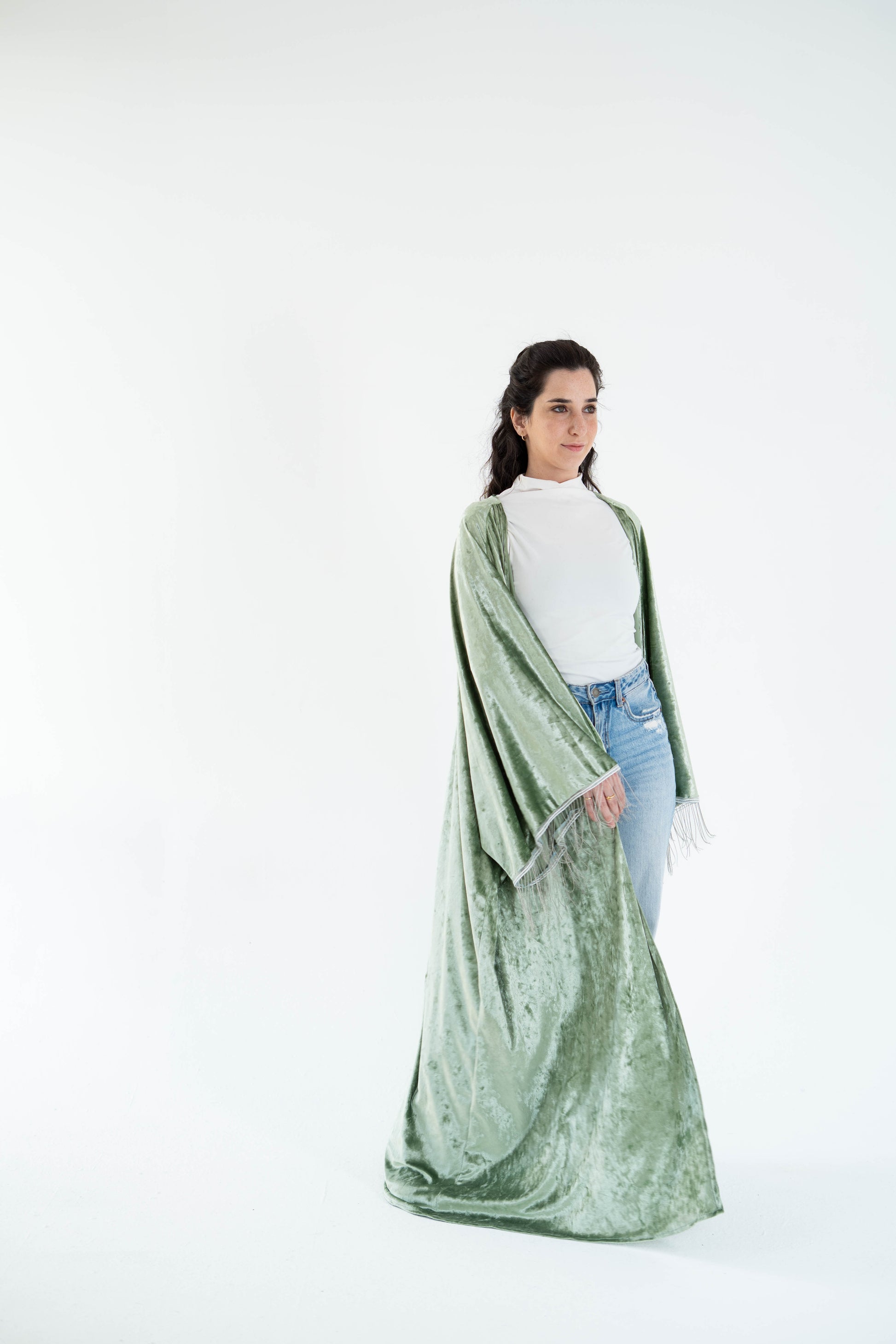 A flowing sage-green velvet kaftan with a relaxed, open-front silhouette that drapes effortlessly to the floor. The fabric has a soft, crushed texture that catches the light beautifully, giving it a subtle luxe feel. Wide sleeves finished with delicate metal fringes details add movement and elegance, while the loose cut makes it easy and versatile
