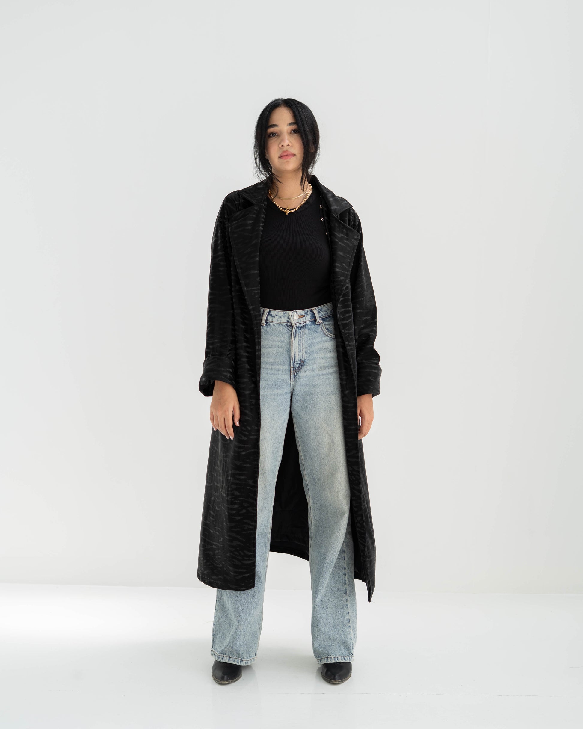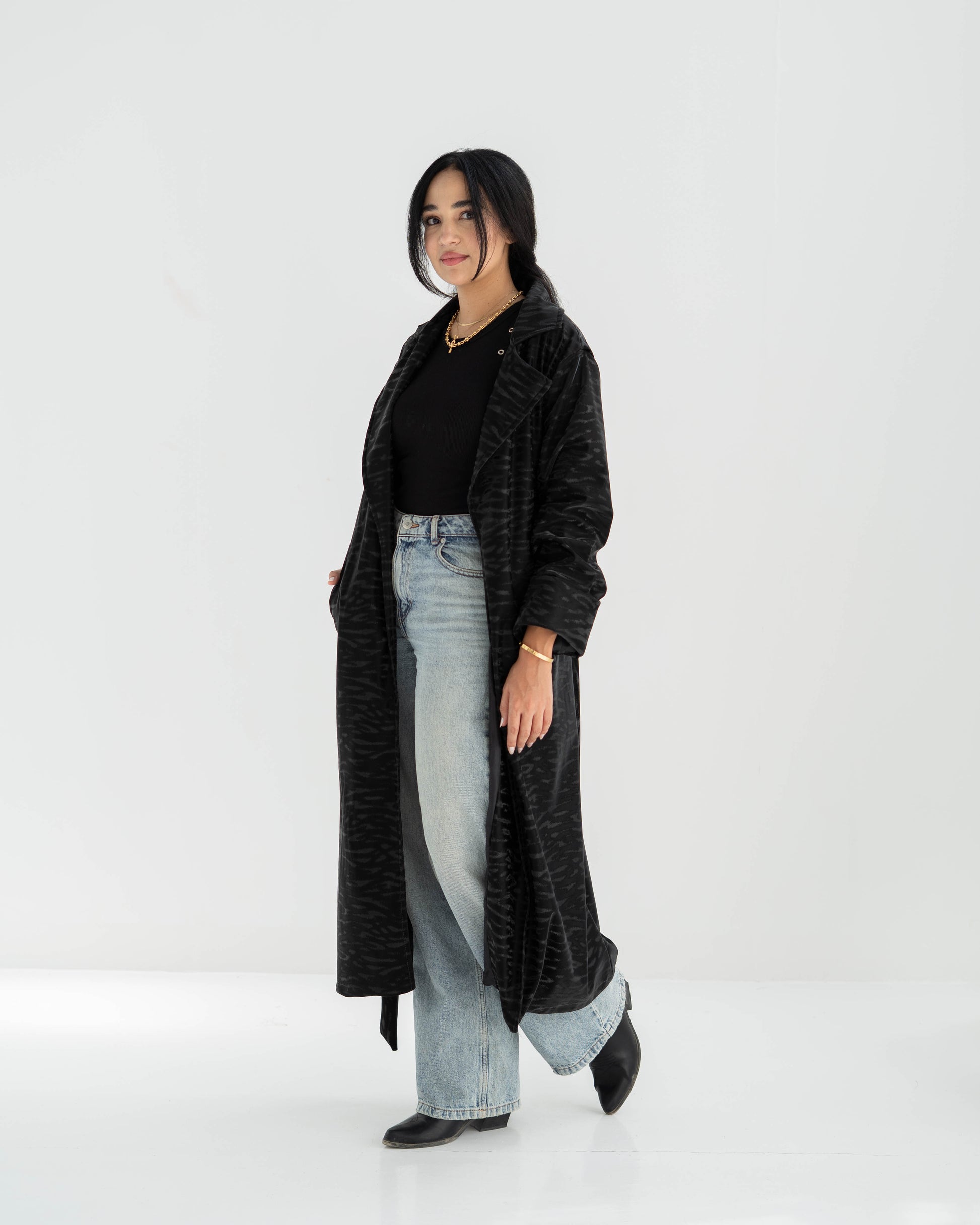 Elevate your outerwear game with this elegant black long coat. Designed with a sleek and modern silhouette, this coat features a subtle pattern that adds texture without overwhelming the eye. The self-tie waist belt allows for a customizable fit, accentuating the waist and creating a flattering shape. Perfect for cooler weather, this coat adds a chic layer to any outfit, whether you’re dressing up for a night out or pairing it with casual jeans for an elevated day look. The luxurious velvet fabric adds a soft touch, making it a versatile and timeless addition to your wardrobe.